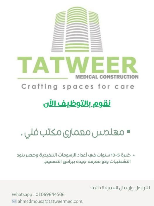 شركة تطوير الطبية للمقاولات تطلب الوظيفة الاتية :مهندس معمارى مكتب فنىخبرة 5 – 1…